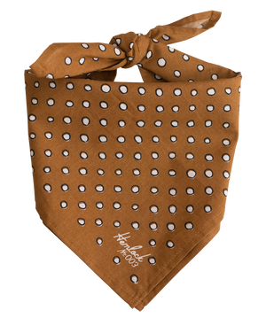 Our bandanas are a classic square style with a finished rolled edge. To tie your bandana, fold the bandana across the diagonal to create a triangle. Roll the bandana to the desired length and tie around your pet's neck.