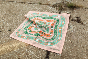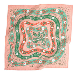 Our bandanas are a classic square style with a finished rolled edge. To tie your bandana, fold the bandana across the diagonal to create a triangle. Roll the bandana to the desired length and tie around your pet's neck.
