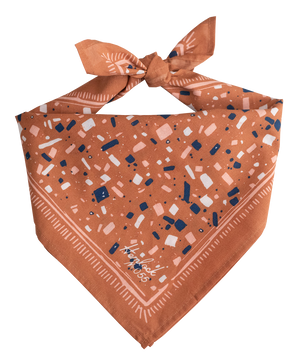 Our bandanas are a classic square style with a finished rolled edge. To tie your bandana, fold the bandana across the diagonal to create a triangle. Roll the bandana to the desired length and tie around your pet's neck.