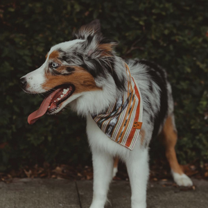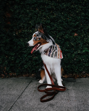 Our bandanas are a classic square style with a finished rolled edge. To tie your bandana, fold the bandana across the diagonal to create a triangle. Roll the bandana to the desired length and tie around your pet's neck.