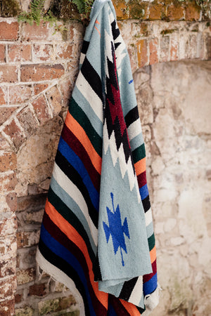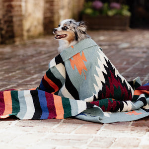 Our Moraine blanket features a classic geometric pattern in a light blue sage. Color bands vary between blankets. This is the most versatile blanket you could own. Use it in your home, in the car, to cover your dog's crate, or any adventure you can think of!