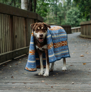 Our bandanas are a classic square style with a finished rolled edge. To tie your bandana, fold the bandana across the diagonal to create a triangle. Roll the bandana to the desired length and tie around your pet's neck.