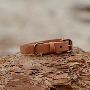 Our Voyager Collar is made from a heavy duty vegan leather alternative. Each collar is made with solid brass hardware with an antique coating, making it rust resistant and perfect for salt water adventures. These collars are waterproof, mud proof, stink proof, and dog proof!