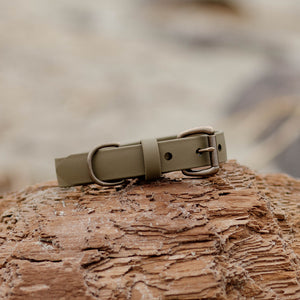 Our Voyager Collar is made from a heavy duty vegan leather alternative. Each collar is made with solid brass hardware with an antique coating, making it rust resistant and perfect for salt water adventures. These collars are waterproof, mud proof, stink proof, and dog proof!
