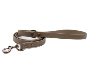 The Rainier Leash is made from heavy duty vegan leather alternative. All of our leashes feature solid brass hardware with a special coating for added durability. These leashes are waterproof, mud proof, stink proof, and dog proof!