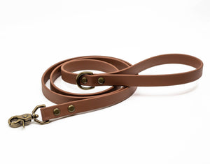 The Rainier Leash is made from heavy duty vegan leather alternative. All of our leashes feature solid brass hardware with a special coating for added durability. These leashes are waterproof, mud proof, stink proof, and dog proof!