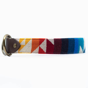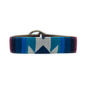 Our Kobuk Collar is made from an Authentic Pendleton® virgin wool fabric. This collar features a soft turquoise with a geometric pattern in dark green, burnt orange, and beige.
