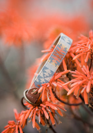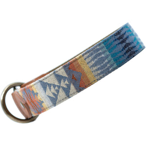 Our Kodiak Collar is made from an Authentic Pendleton® virgin wool fabric. This collar features a soft turquoise with a geometric pattern in dark green, burnt orange, and beige.