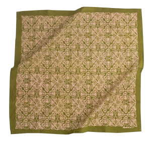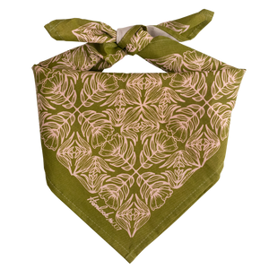 Our bandanas are a classic square style with a finished rolled edge. To tie your bandana, fold the bandana across the diagonal to create a triangle. Roll the bandana to the desired length and tie around your pet's neck.