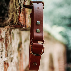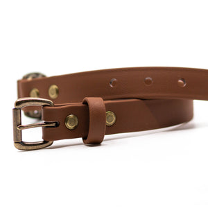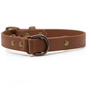 Our Rainier Collar is made from a heavy duty vegan leather alternative. These collars feature Antique Solid Brass hardware. These collars are waterproof, mud proof, stink proof, and dog proof!