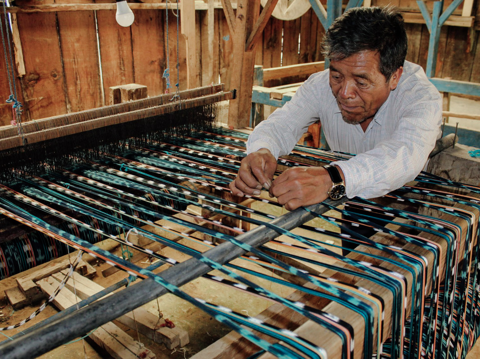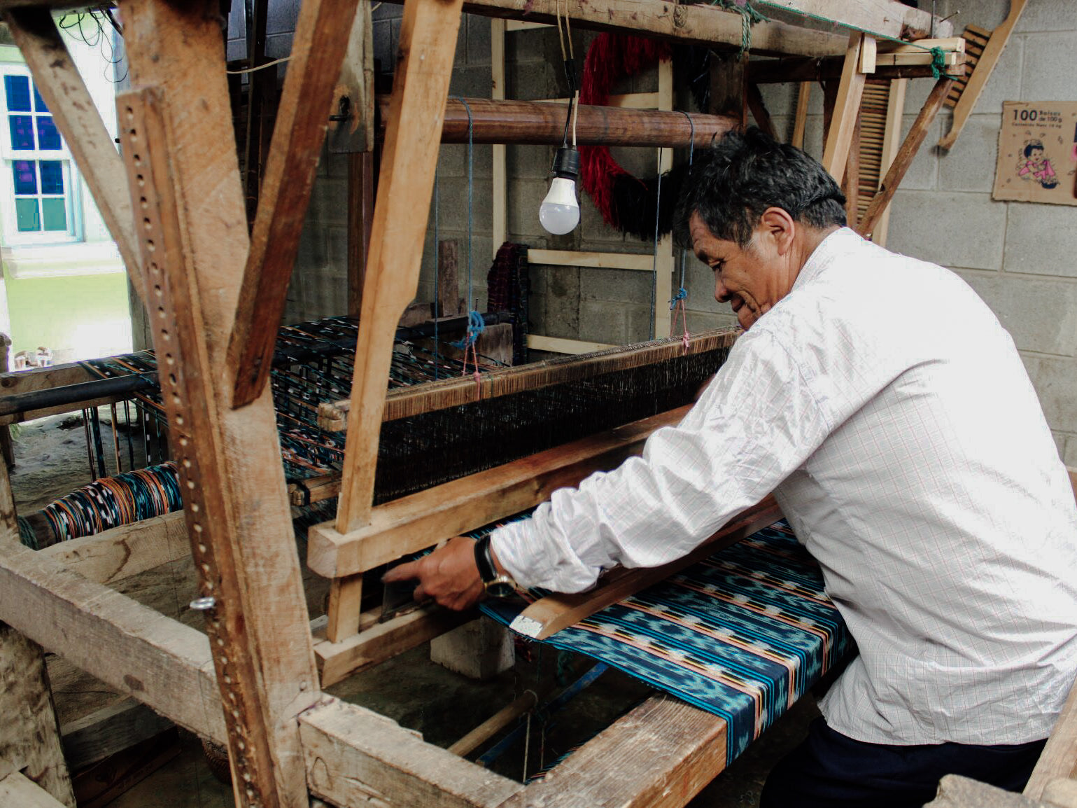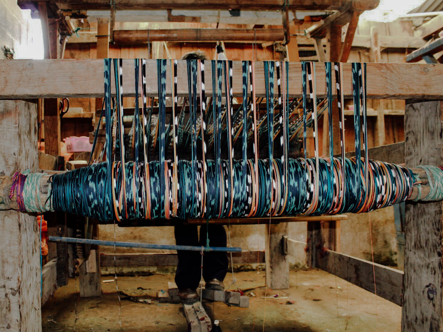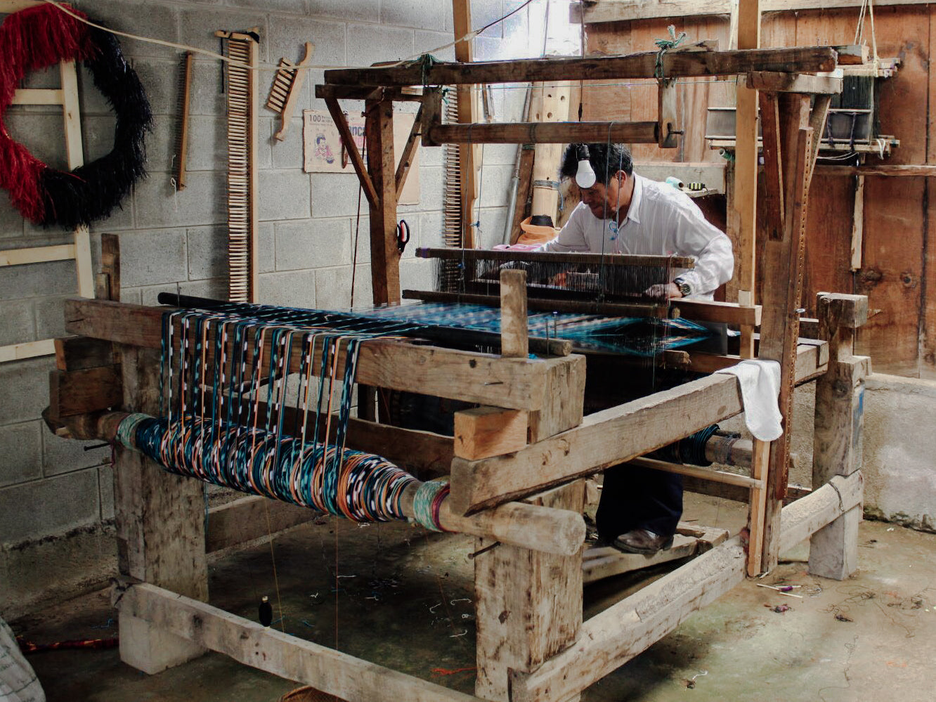 Each loom is first threaded to create the desired pattern. Pedals are used to power the loom, similar to a bicycle. Weavers alternate pushing the pedals with their feet while threading the fabric back and forth.