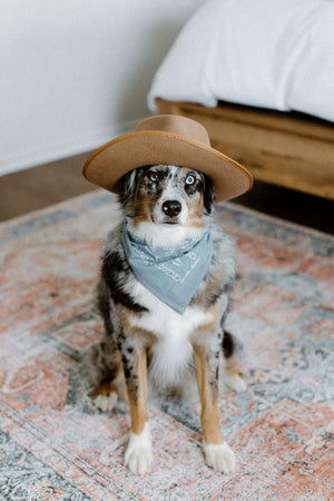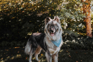 Our bandanas are a classic square style with a finished rolled edge. To tie your bandana, fold the bandana across the diagonal to create a triangle. Roll the bandana to the desired length and tie around your pet's neck.