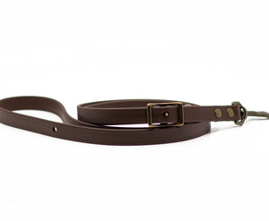 The Summit Leash is made from heavy duty vegan leather alternative. Easily adjust the length of the leash from 5' to 4' or 3'. Simply slide the leash through the buckle to adjust the length.