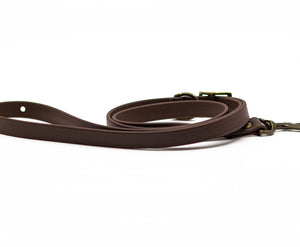 All of our leashes feature solid brass hardware with a special coating for added durability. These leashes are waterproof, mud proof, stink proof, and dog proof!